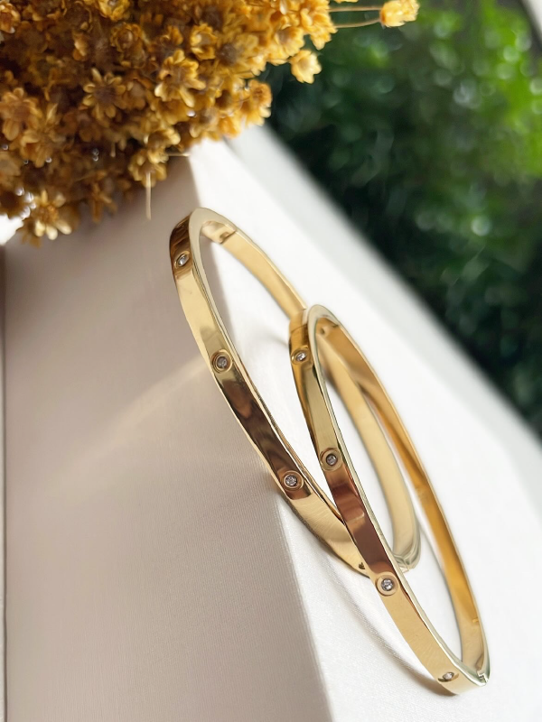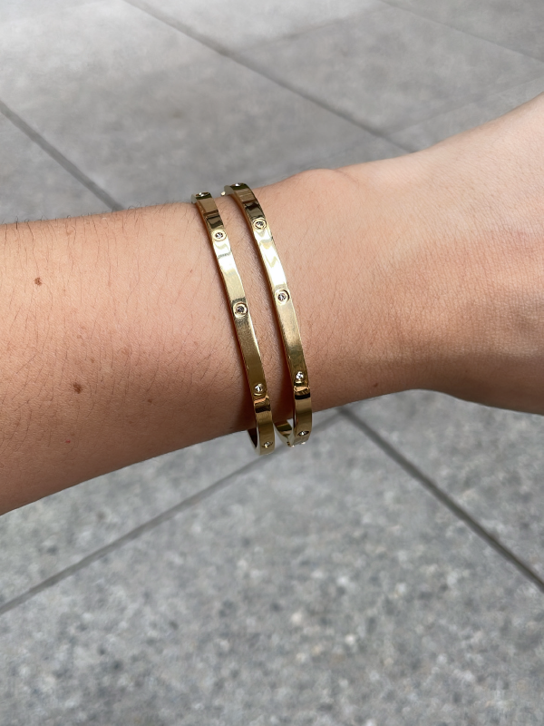 O Bracelete Carol destaca-se pelo seu design “clean” e luxuoso. Cada bracelete possui uma superfície espelhada que reflete a luz com intensidade, interrompida apenas por delicados pontos de zircônia que conferem um brilho sutil e elegante. A estrutura rígida conta com um fecho discreto e seguro, permitindo um ajuste perfeito e anatômico ao pulso.