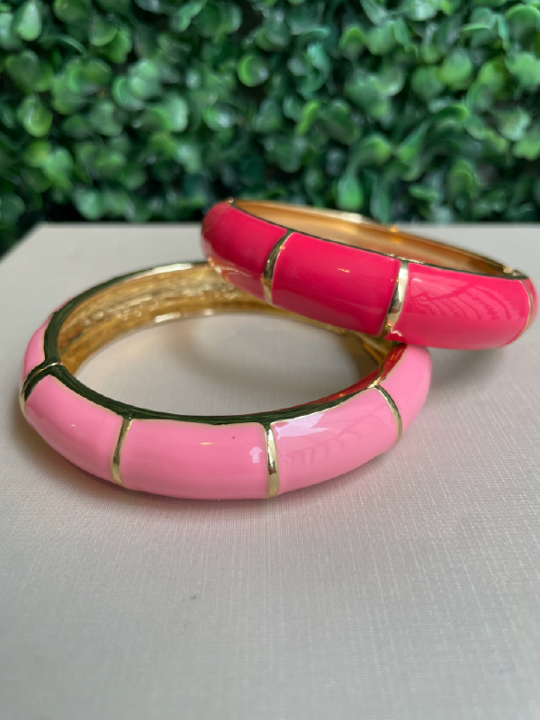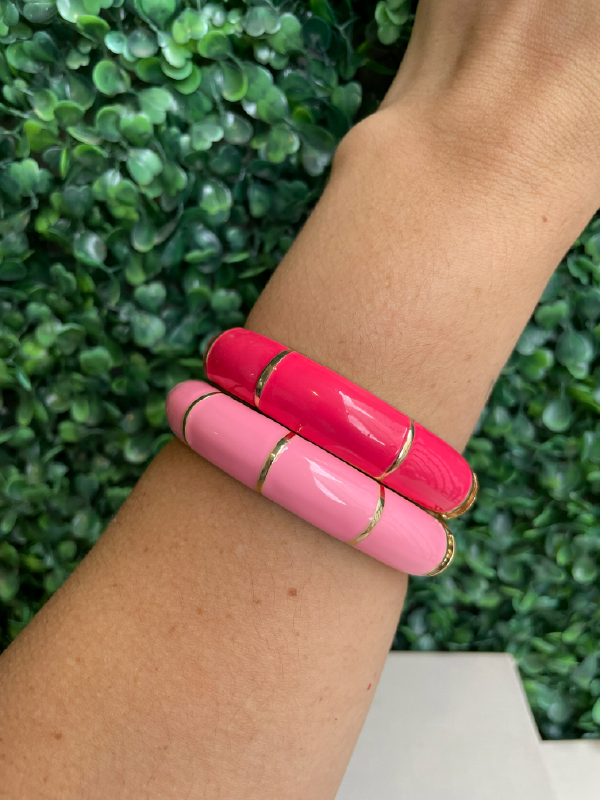 O Bracelete Marcella destaca-se pela sua presença marcante e pelo acabamento impecável da esmaltação colorida. O design é segmentado por anéis dourados que interrompem a cor, criando um efeito de gomos que traz sofisticação à peça. A combinação do rosa vibrante com o rosa suave permite criar looks dinâmicos, cheios de vida e personalidade.