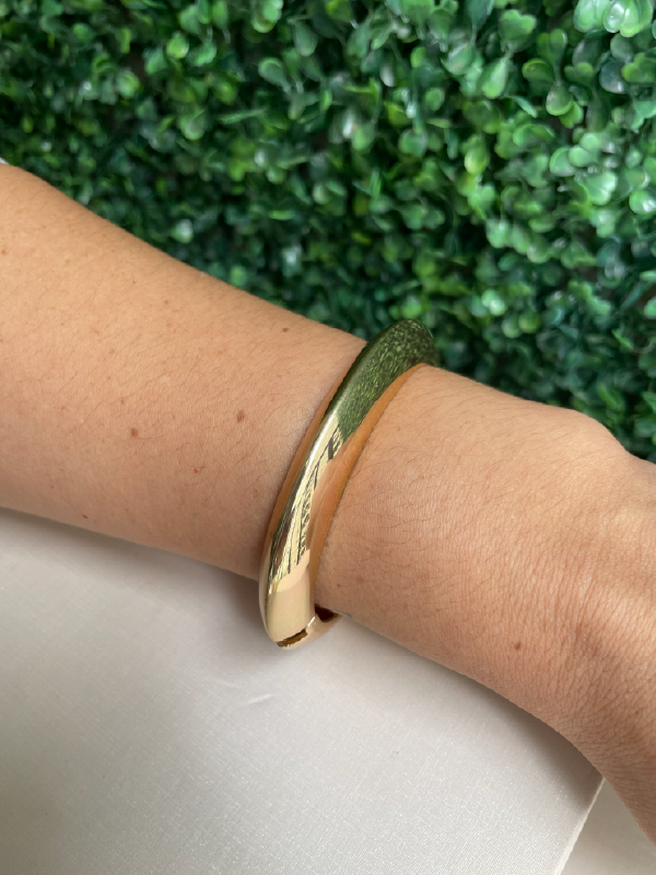 O Bracelete Orgânico Mayara é a personificação da elegância minimalista com um toque contemporâneo. Esta peça rígida apresenta um design liso e polido, com uma silhueta levemente abaulada que valoriza as formas anatômicas do pulso. Seu acabamento em alto brilho e linhas fluidas fazem dele um acessório indispensável para quem busca sofisticação sem esforço.