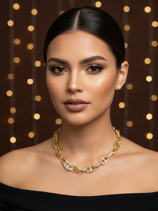 O Colar Inspiração Raquel foi desenvolvido para ser o ponto focal do look. Seu design utiliza a geometria dos elos vazados para criar uma peça leve visualmente, mas com grande impacto estético. O diferencial reside na alternância entre o metal liso e os pontos de cravação em pavê, um detalhe minucioso que remete às joias exclusivas das grandes maisons.
