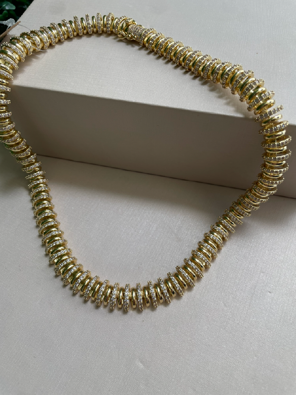 O Colar Natasha foi desenvolvido para ser o centro das atenções. Seu design inovador apresenta uma estrutura composta por múltiplos anéis sobrepostos, criando uma textura tridimensional que captura a luz de todos os ângulos. A alternância rítmica entre o ouro liso e a cravação pavê confere à peça um dinamismo visual que exala poder e refinamento.